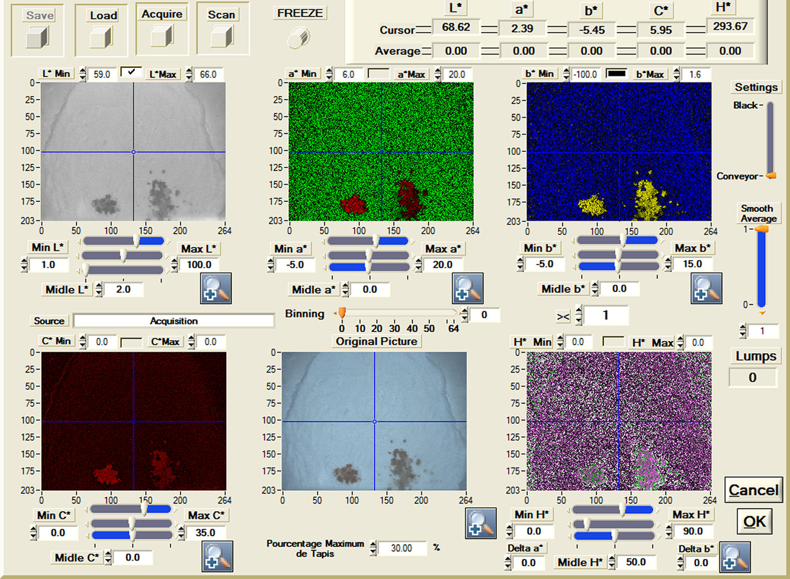 The video of the wet or dry sugar is continuously displayed with the color trend of each centrifugal and the global trend of the full production. The software automatically detects out of specification objects and can trigger alarms or even deviate the sugar to avoid contaminating the dryer or the silos.