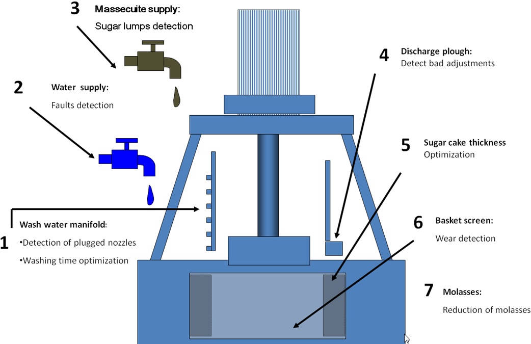 It can also help optimizing the centrifugal maintenance by analyzing the recorded and stored videos of all the alarms : several little brown lumps of sugar on the surface can come from a plugged washing tube; a large surface of really dark sugar means that the plough discharger is not properly adjusted; a drift in colour, common to all centrifugal, means there is a change in the massecuite quality.