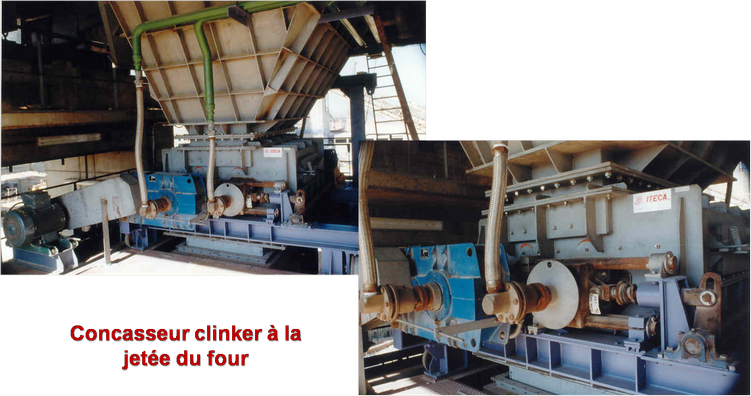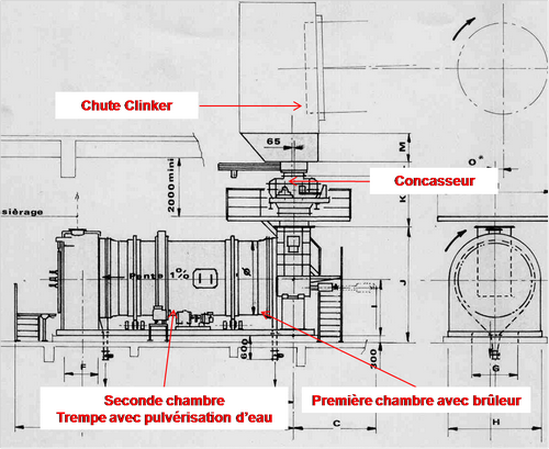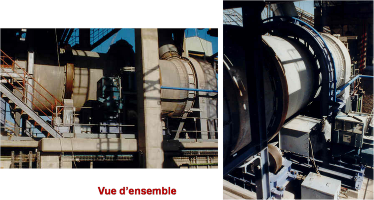 Notre décolorateur dédié au ciment blanc est principalement composé d’un concasseur clinker installé à la jetée du four et d’un refroidisseur composé d’une virole en rotation sur deux galets dans laquelle de trouve un brûleur et des buses de pulvérisation d’eau.